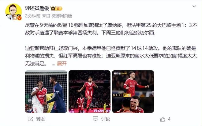 他还提到了迪亚斯。“迪亚斯帮助拜仁轻取门兴,本季德甲他已经贡献了14球14助攻。他的离队的确是利物浦的损失,但红军高层也有难处:迪亚斯原来的薪水太低要求的加薪幅度太大无法满足。”